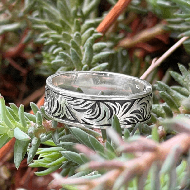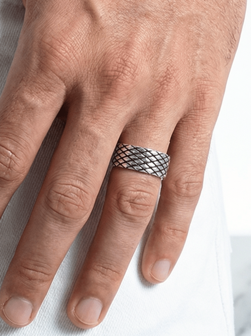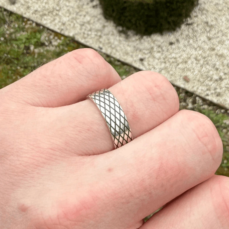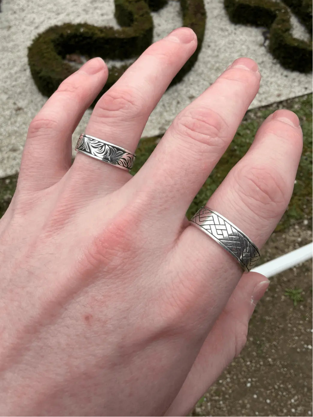 Ich verwende ausschließlich 925 Sterling Silber, weil ich selbst nichts anderes tragen würde. Im Gegensatz zu beschichteten Ringen bleibt ein massiver Sterling Silber Ring dauerhaft hochwertig und entwickelt mit der Zeit eine individuelle Patina, die ihm noch mehr Charakter gibt. Kein billiger Modeschmuck – sondern ein Ring, der mit dir altert.